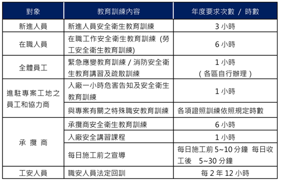 本公司依據《職業安全衛生法》及相關子法之規定,建構系統化的職業安全衛生教育訓練架構,針對全體員工、承攬商及其他相關利害關係人,提供分層分級之訓練課程,確保其具備必要之安全衛生知識與應變處置能力,有效預防職業災害發生。教育訓練內容及實施頻率如下表: